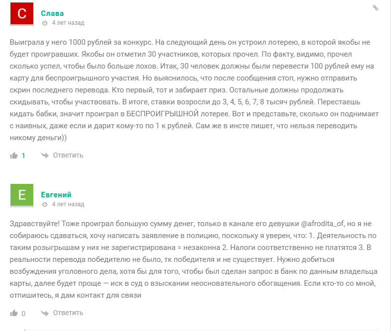 Однако в отзывах, а также предыдущем проекте Фролова схема расписана более подробно. Пользователям предлагали участвовать в лотерее. Для этого необходимо было переводить указанную сумму на счет неизвестного пользователя. Якобы тот, кто будет первым на определенном этапе, тот забирает себе призовой фонд.