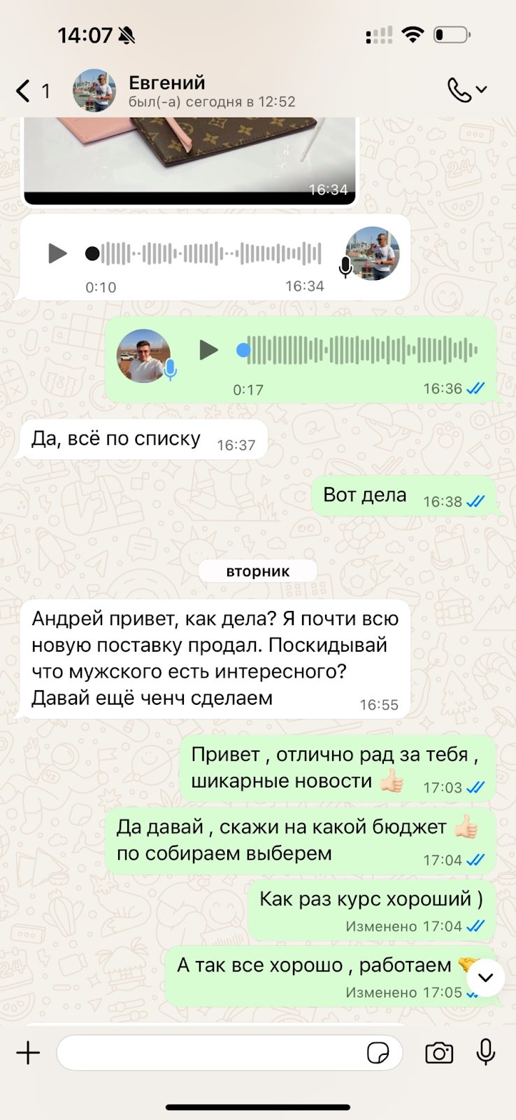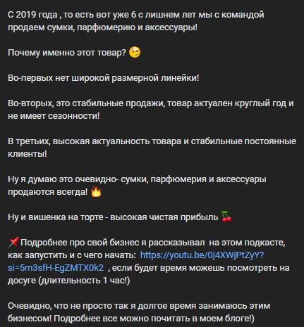 В первом сообщении инвестор обещает выслать всю информацию о бизнесе в ближайшие дни, а пока предлагает ознакомиться подробнее с его личной историей успеха. Андрей Кириллов утверждает, что более шести лет на 2025 год вместе с командой продает сумки, парфюмерию и аксессуары. Главными преимуществами бизнеса он называет: