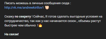 Через соцсеть ВКонтакте Андрей Кириллов предлагает получить инструкцию по запуску онлайн-магазина сумок и парфюмерии совершенно бесплатно. Обещанная прибыль превышает ₽350,000. Клиенту якобы достаточно только разрешить сообщения от группы.