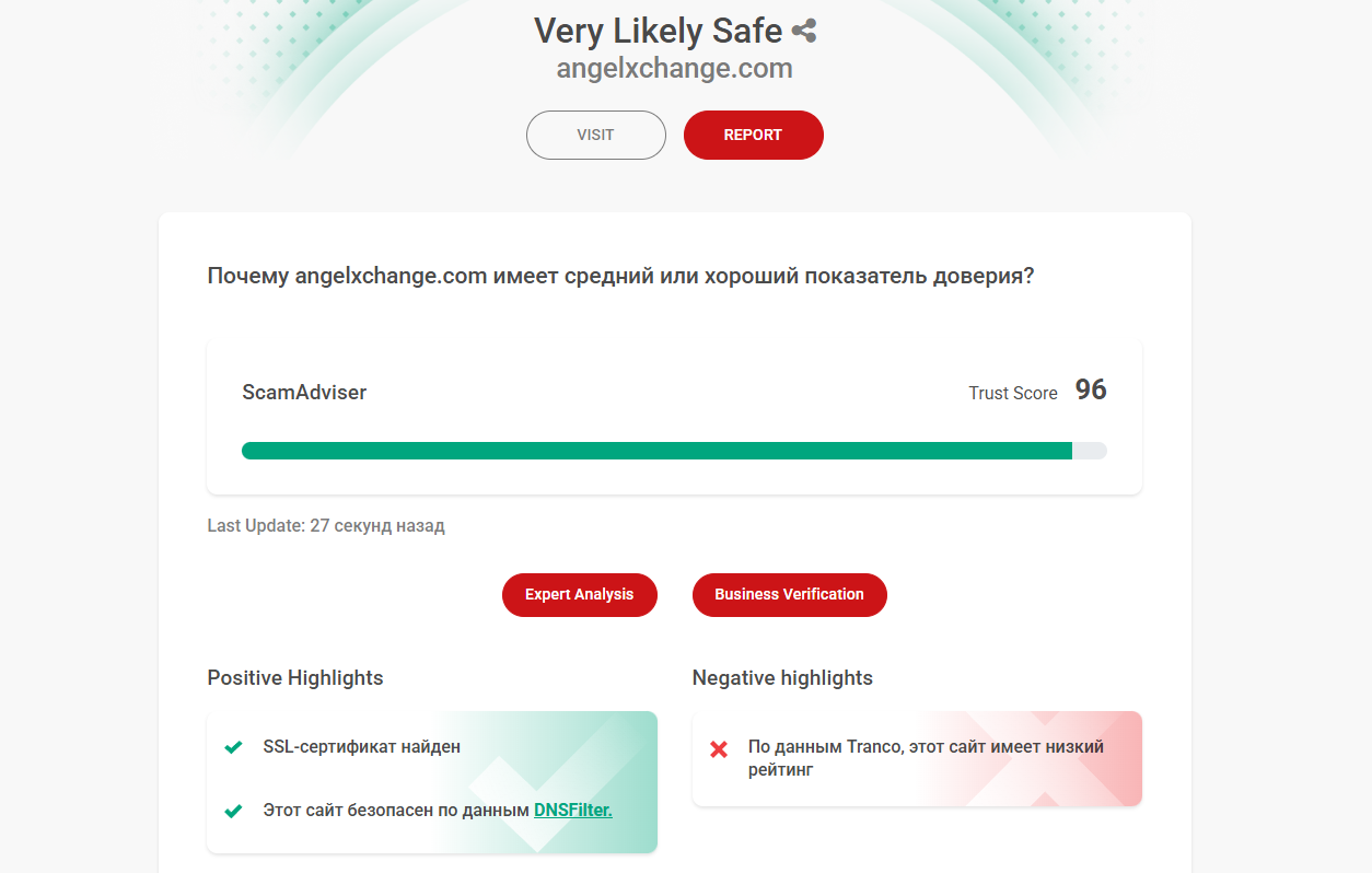 В интернете встречаются преимущественно негативные упоминания о проекте. При этом агрегаторы по проверке безопасности доменов ставят AngelXchange com высокие оценки. В них отмечается высокая защита, но довольно низкая посещаемость.