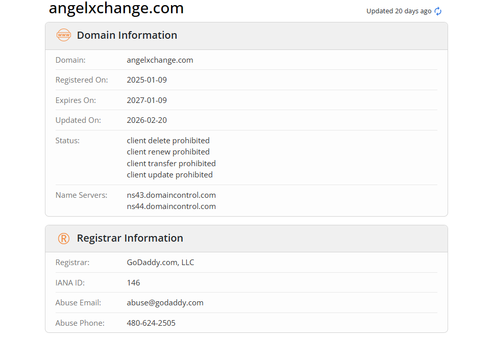 По данным Whois, сайт проекта был зарегистрирован в 2025 году через регистратор GoDaddy. На главной странице описан список криптовалют, калькулятор обмена, форма для реквизитов и аккаунт поддержки в Телеграмм AngelXchange Support. При этом информации о лицензии или юрисдикции нет, а профиль в мессенджере неактивен.