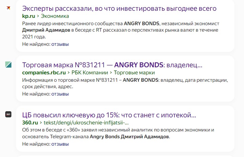 Владельца тг-канала Angry Bonds Дмитрия Адамидова постоянно приглашают, как профессионального эксперта, прокомментировать те или иные ситуации. Он давал интервью в известных СМИ: RT, 360 ru, КП, на ресурсе Smart-lab, популярным блогерам в «Ютубе».