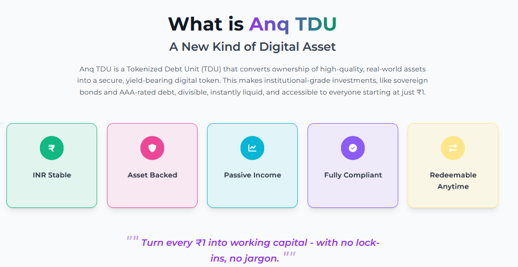 Основным предложением платформы является получение пассивного дохода с активов. Он начисляется в индийских рупиях, связан с выпущенным токеном ANQ TDU. Крипта обеспечивается реальными активами, золотыми запасами и суверенными облигациями.