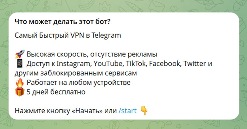 В описании к боту «Антизапрет Vpn» указано, что это самый быстрый Впн в Телеграме. Программа работает быстро и без рекламы. С ней гарантируется стабильный доступ ко многим заблокированным сервисам, среди которых YouTube, Twitter и TikTok. В течение 5 дней сервис работает бесплатно, что позволяет протестировать функциональность, но потом придется оплачивать услуги.