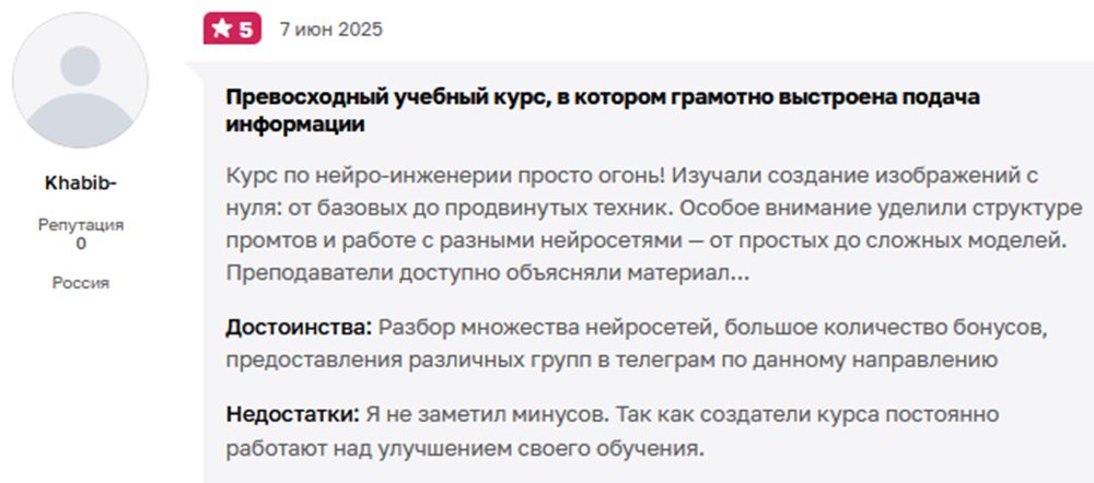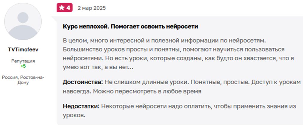 Судя по отзывам, информация может быть полезной для новичков, не разбирающихся в нейросетях и особенностях заработка в этой области. Но для человека, уже имеющего определенную базу знаний, курсы бесполезны.