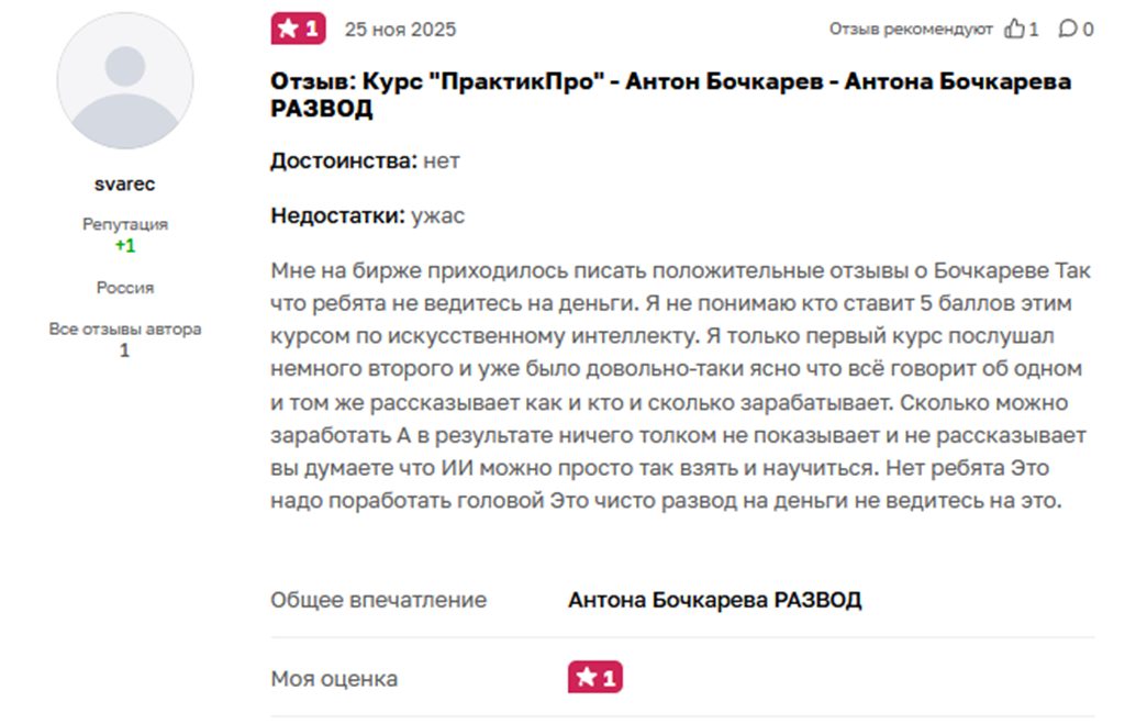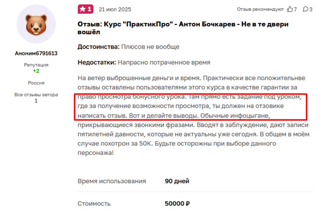 Негативные отзывы об Антоне Бочкареве также говорят о низкой эффективности обучения. Материал неактуальные, многие данные сильно устарели. Обучение по большей части – громкие призывы начать зарабатывать без уточнения, как именно это сделать.
