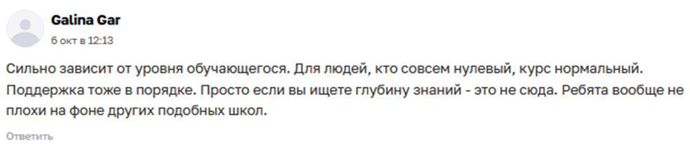 Но на сайте Школы нет состава преподавателей, верифицированной статистики эффективности обучения. Только громкие лозунги и призывы записаться. Большим преимуществом является возможность бесплатного участия. Но для многих важно получение хорошей базы знаний. А часть отзывов от учеников говорит, что в Школе больше проводят мотивирующие тренинги, чем занятия.