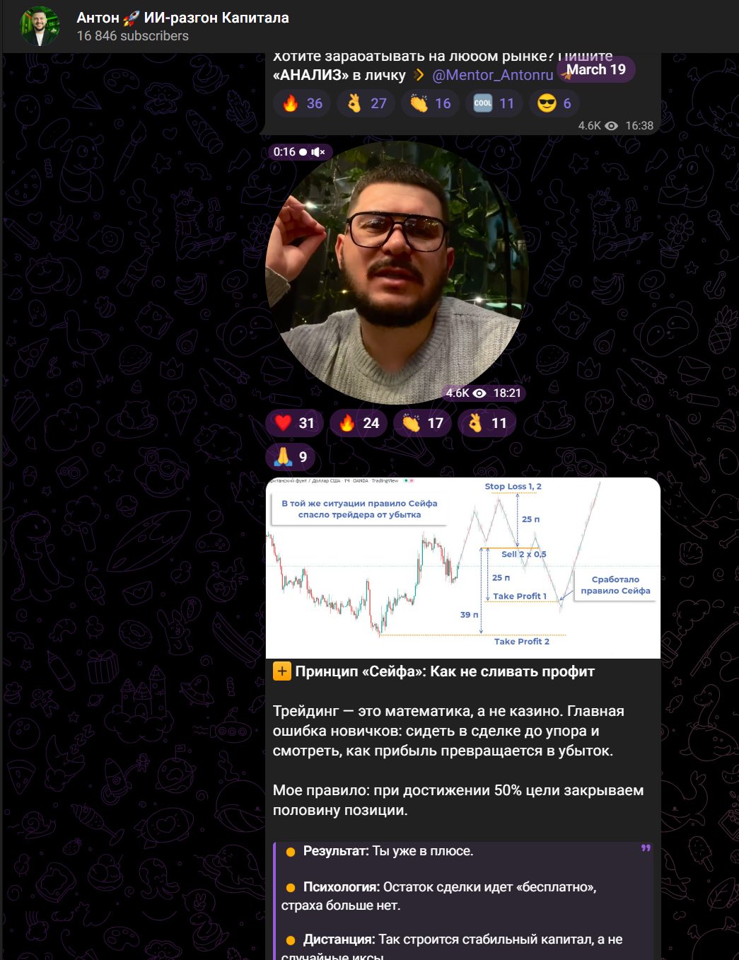 ТГ канал Антон ИИ Разгон капитала появился более двух лет назад. Аудитория составляет 16 800 пользователей, из них 4,5-5 тысяч читает посты регулярно, с наибольшей вероятностью, это накрутка численности и активности. Комментирование автор отключил, о себе дает очень мало сведений: простой парень смог заработать на трейдинге миллионы и теперь готов помогать окружающим решать финансовые проблемы. Не стоит обольщаться, никаких доказательств образования, опыта и доходности трейдер не предоставляет.