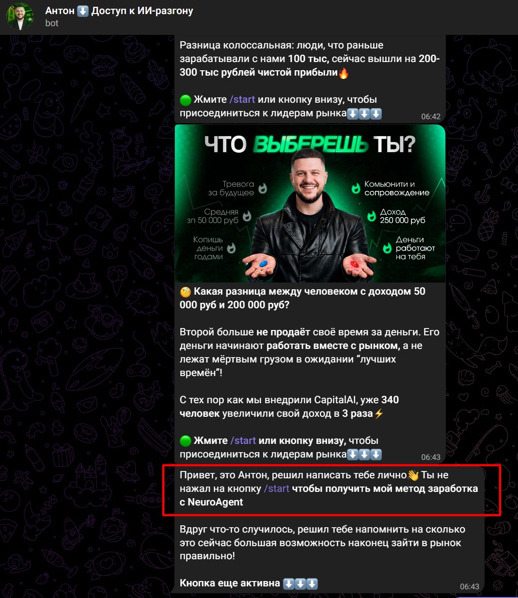 Полезного контента в канале мошенника Антона ИИ Разгон капитала нет. Периодически автор выкладывает небольшие заметки с обучающими материалами, но они не помогут читателю разобраться в трейдинге. Большую часть времени идет агрессивная реклама подключения к боту. В качестве доказательств Антон выкладывает скриншоты заработанных ROI, но доверять им не стоит, так как верифицированной отчетности по сделкам нет. Важный момент: если бы робот NeuroAgent давал такие потрясающие точки входа и тейки, что на нем можно было бы стабильно зарабатывать, к тому же иметь растущую кривую доходности, то Антону не было бы нужды рекламировать софт. Достаточно было бы открыть копитрейдинг на любой официальной бирже, клиенты набежали бы сами.