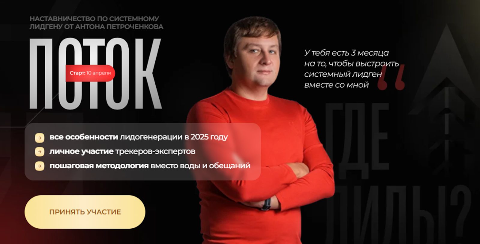 Также Антон предлагает услугу личного наставничества по системному лидгену «Поток». Обучение ведется в малых группах, старт нового потока запланирован на апрель 2026 года.