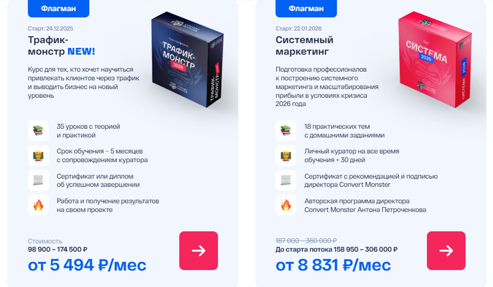На сайте Convert monster представлен перечень актуальны курсов, которые можно пройти в 2026 году. В общей сложности за годы работы на проекте было запущено порядка 100 учебных направлений. Вот какие курсы можно купить: