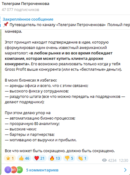Телеграм-канал собрал порядка 47 000 подписчиков, здесь масса полезной информации для начинающих и действующих маркетологов, арбитражников трафика. Мужчина здесь также делится личным контентом, рассказывает об основных событиях в жизни и карьере, делает анонсы старта курсов и мероприятий.