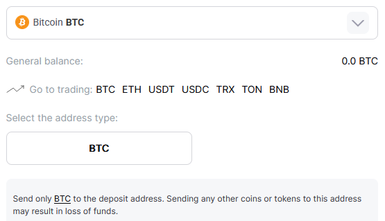 Пополнить счет можно только в криптовалюте. Доступны BTC, BNB, ETH, TON и другие. Точные сроки зачисления и комиссионные не указаны.
