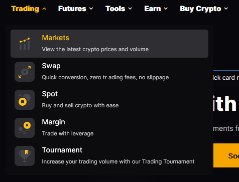 Перечень услуг и инструментов стандартный. Это торговля криптой и фиатом, фьючерсами, акциями и другими активами. Потенциальным клиентам доступно подключение к рынкам, споты, быстрый обмен валют, маржа.