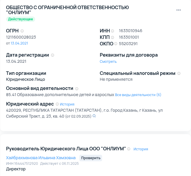 Продавец обучающего курса официально оформлен на отдельное юрлицо — общество с ограниченной ответственностью «Онлиум». Директором там значится совершенно другой человек, а вовсе не Анжела Шнайдерман. Само по себе такое разделение реальных владельцев и публичных экспертов встречается в онлайн-школах довольно часто. Поэтому будущим ученикам заранее уточнять, с кем именно они заключают договор.