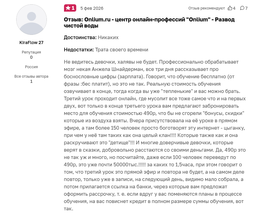 Реальные отзывы о школе «Онлиум» и курсах Анжелы Шнайдерман формируют довольно неоднозначный и смешанный фон. Сами авторы с гордостью ссылаются на высокий рейтинг 4,9 на популярном портале Otzovik. Действительно, многие пользователи искренне благодарят платформу за доступную подачу материала и полезные видеоуроки.
