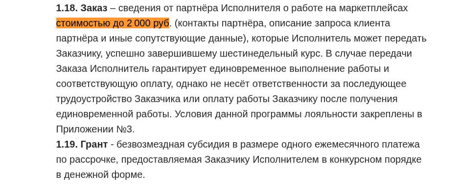Рекламное обещание стопроцентного трудоустройства в тексте оферты моментально сужается до передачи одного разового партнерского заказа стоимостью до 2000 рублей. Исполнитель прямо и однозначно прописывает, что совершенно не несет ответственности за любые дальнейшие доходы ученика.