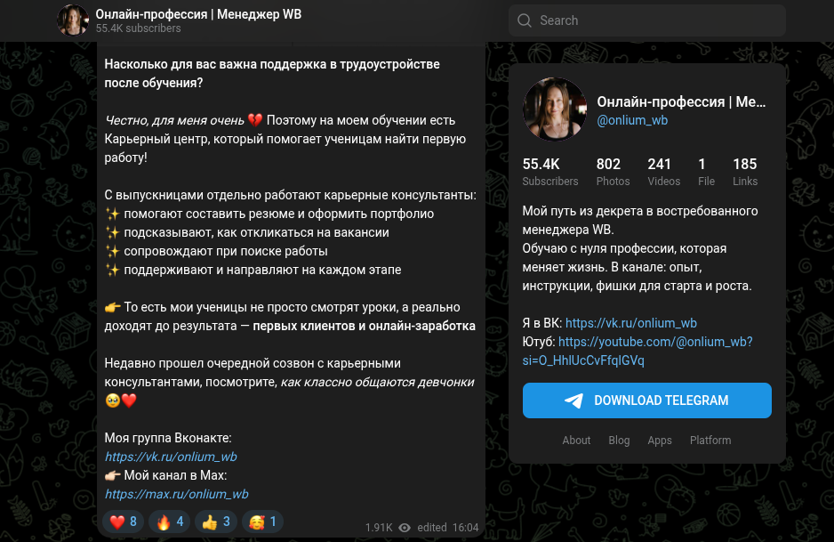 Внутри корпоративной экосистемы авторы используют сразу несколько разных названий: SheWork, Onlium и лаконичное «Онлайн-профессия | Менеджер WB». Сайт Shework Ru — основная площадка, куда методично направляют весь платный рекламный трафик. Клик по иконке Telegram в подвале ресурса переведет на контактную карточку @ Onlium Centr, которая подписана именем основательницы.