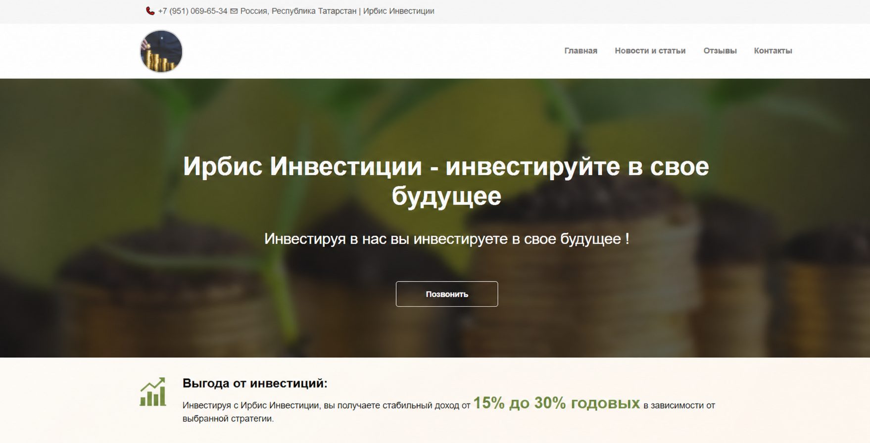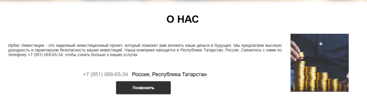 Детально ознакомиться с продуктами инвесторы в проект «Ирбис Инвестиции» могут посредством номера телефона +7951 069 65 34. Другие способы взаимодействия с представителями компании не представлены.