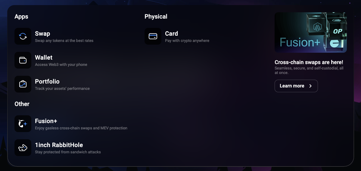 Кроме непосредственно обмена и трейдинга, у инвестинг-проекта 1inch есть еще множество продуктов и функций, например, wallet и card. Первый позволяет, как заявлено, надежно хранить активы, а второй дает возможность оплачивать товары в любых магазинах.