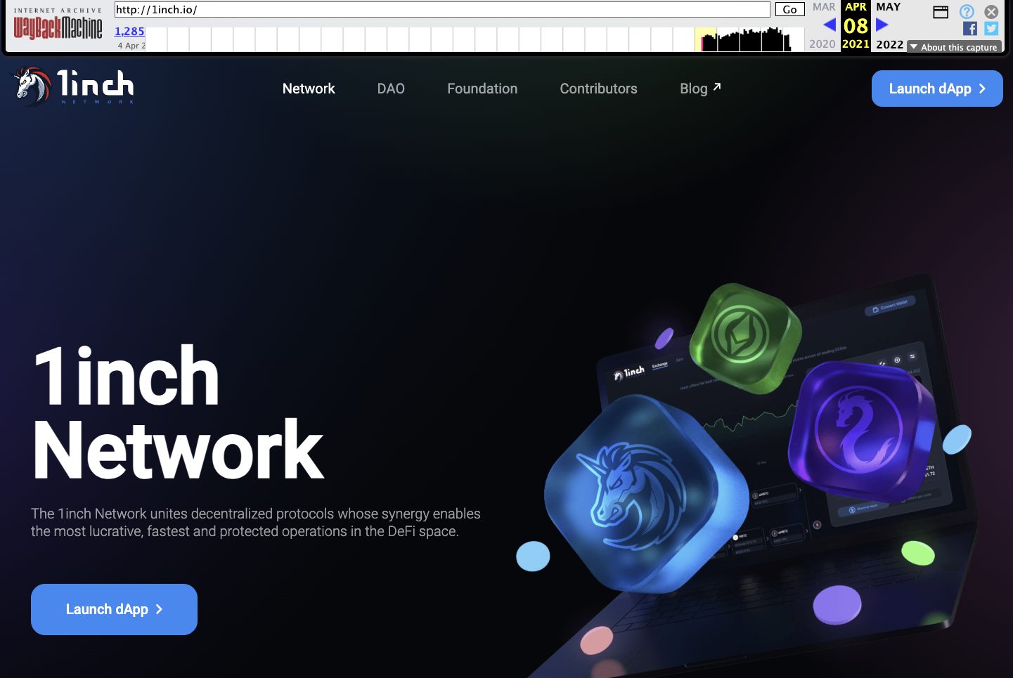 Выяснили, что домен был зарегистрирован еще 22 мая 2019-го года. Это как раз то время, когда проходил хакатон, на котором появилась первая версия платформы 1 Inch.