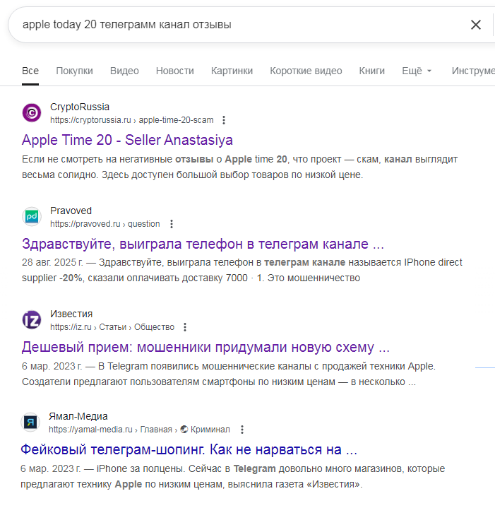 По итогам нашего расследования мы пришли к выводу, что приобретать товары через telegram-канал «Эппле Тудей 20» Apple Today 20, который выставляет себя интернет-магазином, не нужно. Это лохотрон, который периодически переименовывается, чтобы создать впечатление нового проекта. Ни одного положительного момента в его работе мы не обнаружили.
