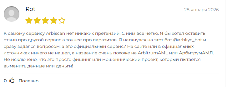 В целом в интернете неплохо отзываются о сервисе: проект не предлагает никаких услуг, а потому априори вряд ли может кого-то обмануть. В одном из отзывов человек пишет, что на официальном сайте все работает корректно и претензий к нему нет. Однако, по его словам, Arbiscan Io пытаются копировать мошенники, создающие различных ботов в Telegram. Такое вполне возможно, поэтому важно проверять подобные проекты.