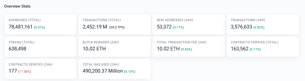 В “Resources” есть общая статистика насчет числа операций, новых адресов, токенов и т.д. Причем показатели одновременно отображаются как за все время, так и за последние сутки.