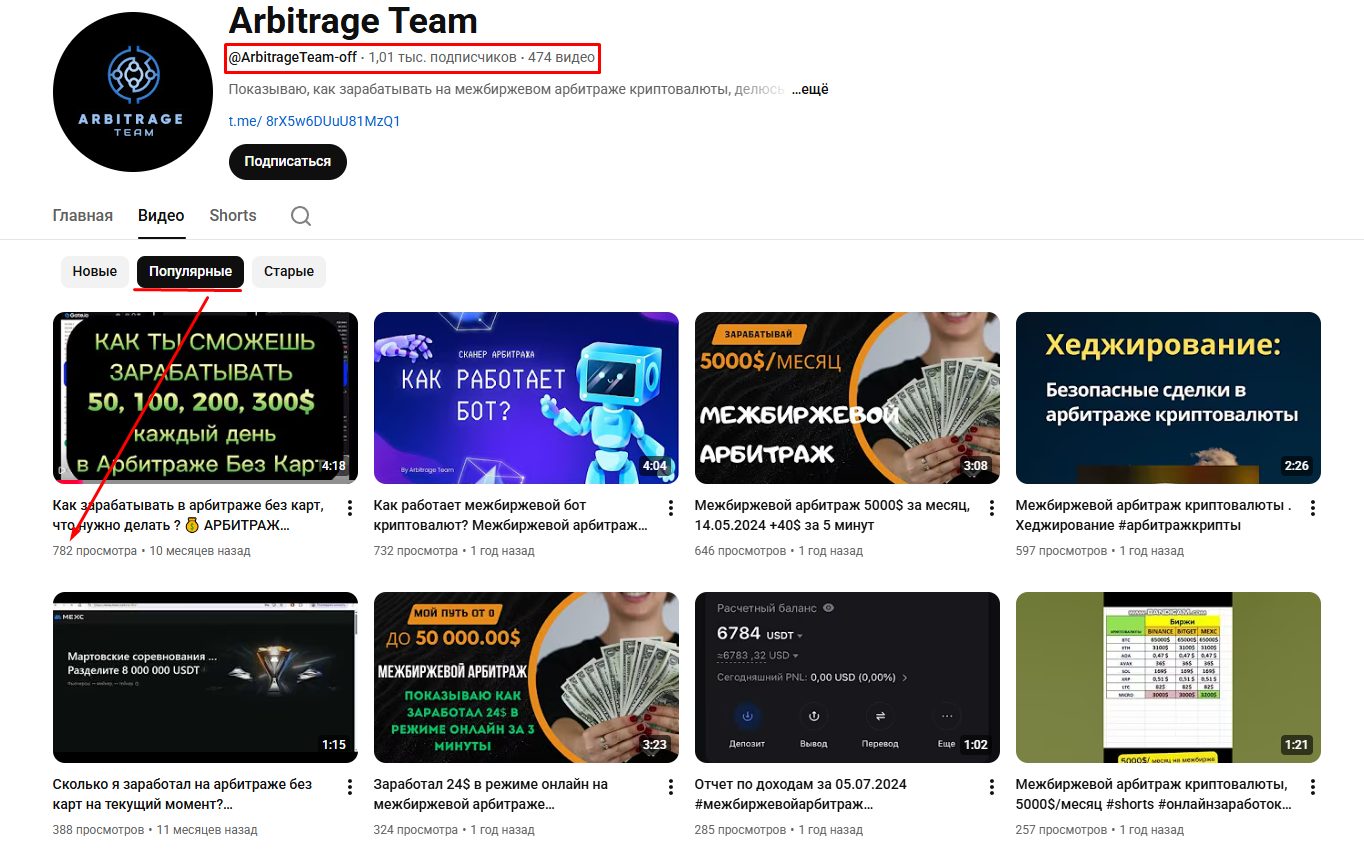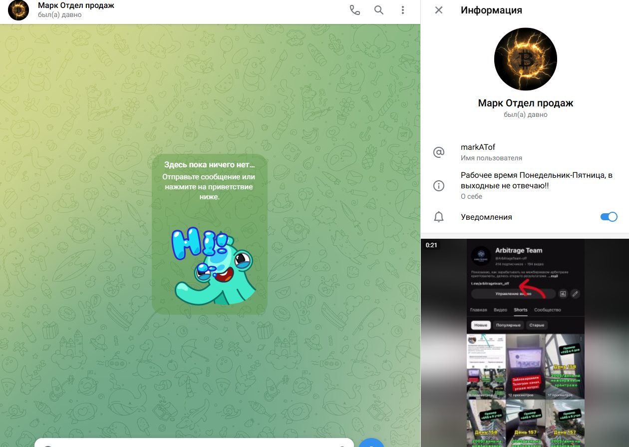 Автор тг канала Arbitrage Team скрывает свою личность, а также постоянно изменяет логин аккаунта, что является серьезным красным флагом. Нередко так мошенники заметают следы, а в интернете одного человека замечали под следующими именами: Mark Arb Team, MarkATof, P2P MarkTeam. В профиле нет личных изображений, только один ролик в качестве лендинга, где показывают ссылку на основной ресурс.