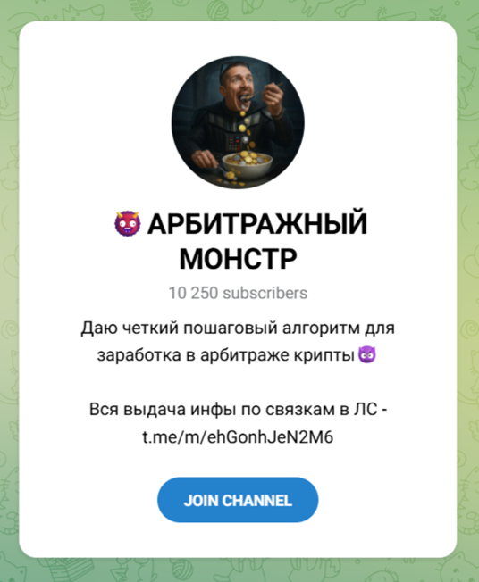 На канале «Арбитражный Монстр» более 10000 подписчиков, а у постов примерно по 1000 просмотров. По словам автора сообщества, у него есть опыт в крипте и арбитраже. В ленте можно встретить истории из прошлой жизни блогера, но главный акцент поставлен на свободу, поэтому он пропагандирует возможность зарабатывать в любом месте. Все это формирует эмоциональный фон, но практически не дает представление о том, как обеспечивается доход.