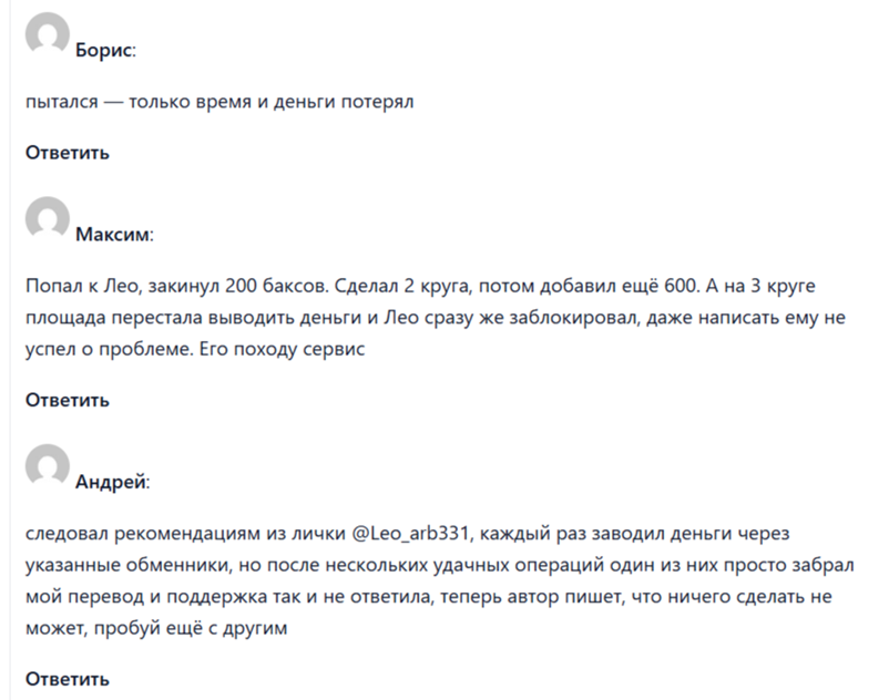 В сети встречаются разные истории людей, которые работали по связкам Leo Arb331. В личные сообщения они получали рекомендации и алгоритмы. Сначала работа идет без проблем, а потом деньги пропадают. Обращение к Лео не решало проблему, поскольку он говорил о резких блокировках, ошибках и не возможности возврата. Получить деньги ни у кого не удалось. Затем мошенник ищет других жертв.