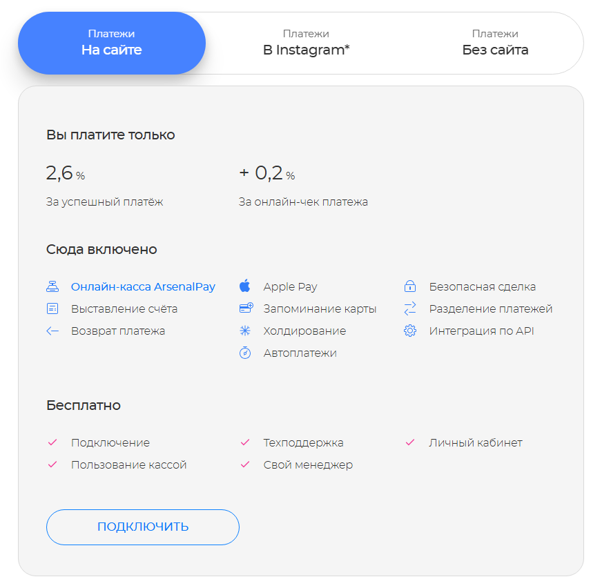 Мы выяснили, что за каждый успешный платеж клиент платит 2,6% комиссии плюс 0,2% за онлайн-чек. В эту стоимость включены все функции, о которых мы рассказывали выше. Бесплатно предоставляется: