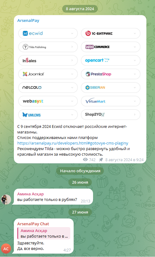 Компания ведет аккаунты в Telegram, ВКонтакте и ТикТоке. Контент везде практически одинаковый: реклама своих услуг и инструкции по использованию функций системы. Комментарии на платформах открыты, клиенты могут оставлять вопросы прямо под постами или писать на почту info @ arsenalpay ru. Мы проверили работу клиентской службы — ответы приходят быстро, вопросы решают оперативно, что добавляет плюсов с точки зрения взаимодействия с пользователями.