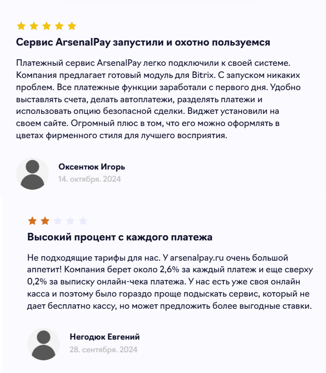 В интернете мы нашли в основном положительные отзывы о работе с «Арсенал Пей». Но наряду с положительными оценками удобства, интеграции и поддержки, в откликах присутствует критика, связанная с завышенными тарифами на прием платежей и выдачу онлайн-чеков.