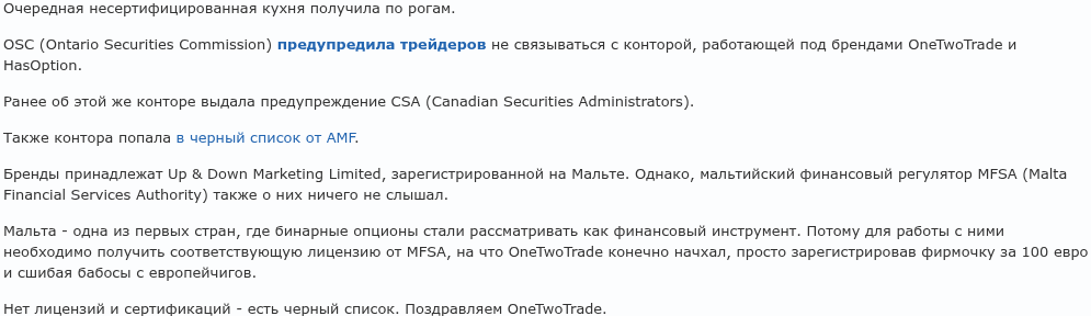 В сети о партнере эксперта по криптовалютам и трейдингу Артема Фролова упоминания крайне негативные. На одном форуме пользователи пишут, что брокер OnetwoTrade зарегистрирован на Мальте под управляющей компанией Up & Down Marketing Limited. Ей же принадлежит и другой бренд — HasOption.
