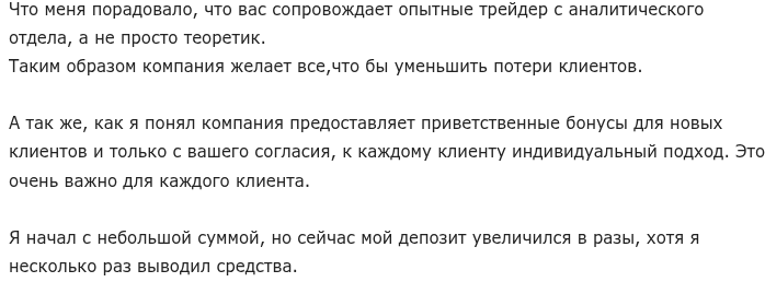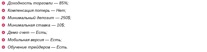 На другом форуме мы нашли краткие условия партнера Артема Фролова: старт от 250 долларов, ставка от 10 долларов, есть демо счет и мобильная версия. Как ранее писал эксперт по трейдингу, компания дает образовательные материалы.