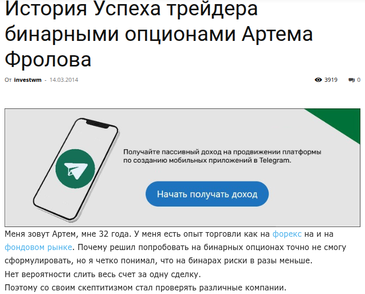 Проект «Фролов Артем Трейд», ТГ отзывы о котором отсутствуют, предлагает зарабатывать на трейдинге. Однако вместо того, чтобы покупать и продавать высоколиквидные активы, например, фондовые индексы, надо торговать бинарными опционами. Более того, Артем отмечает, что партнерская биржа, через которую он заключает сделки, предоставляет максимально лояльные условия. Однако настоящую статистику успешных сделок трейдер не демонстрирует.