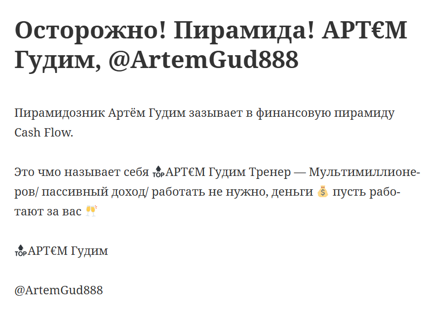 Нет никаких доказательств, что Артем Гудим вообще разбирается в инвестициях и понимает, что делает, а истории, выложенные в профиле, считать подтверждением экспертности не стоит, да и пользователи, которые общались с владельцем аккаунта, пишут про финансовую пирамиду, соответственно, любое сотрудничество с ним несет высокие риски потери средств, поэтому связываться с таким человеком мы не советуем.