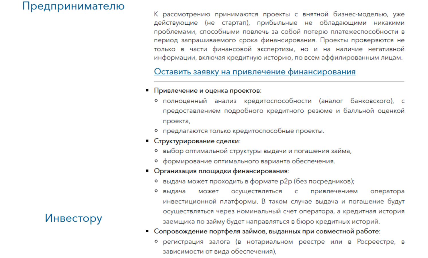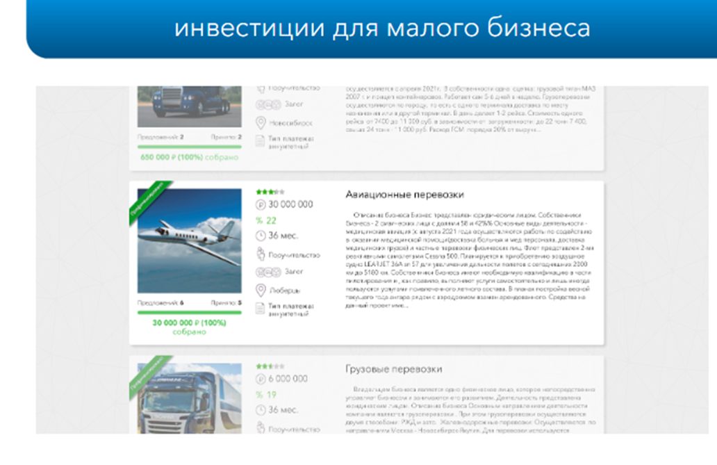 На сайте есть информация об уже реализованных проектах. Их описание, дата открытия, результаты для инвесторов.