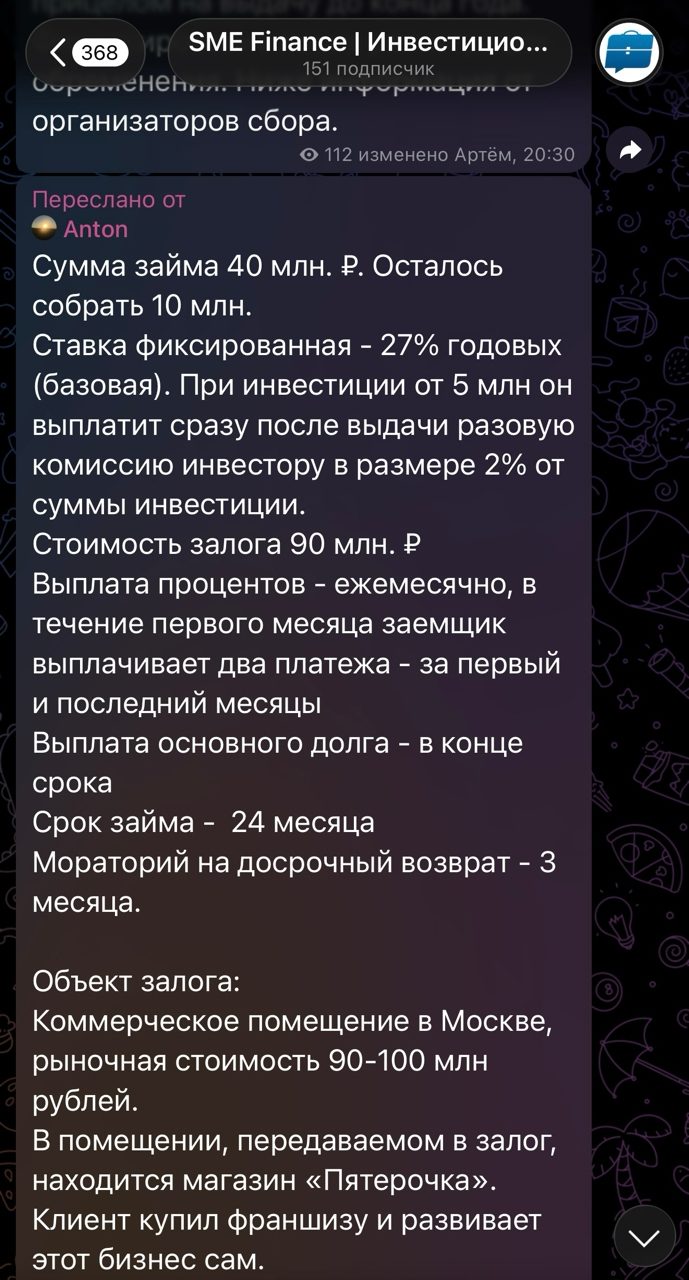 Из социальных сетей инвестор ведет только канал в Телеграме «Инвестиционное сообщество SME Finance». Но подписчиков у него немного – всего 158 человек.