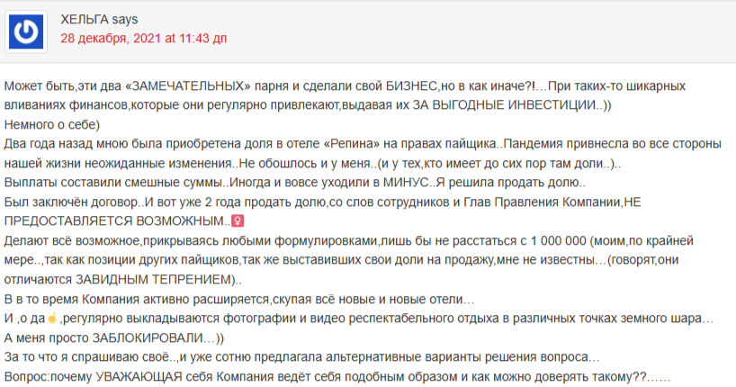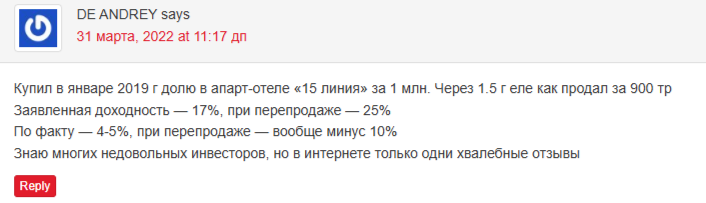 Еще один из обманутых пайщиков сообщает, что обещанная доходность сильно преувеличена. Максимум можно получить 4–5% из обещанных 20%. Продать жилье нереально, а если это и получится сделать, то за гораздо меньшую стоимость.