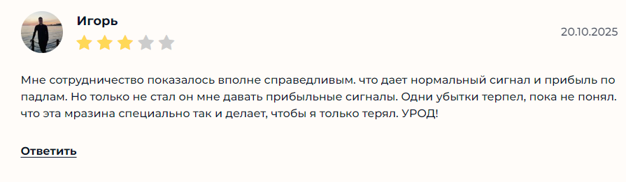 - В негативных отзывах пользователи рассказывают, что бесплатные и платные торговые сигналы привели их к убыткам, а значит клиенты только потеряют деньги, если будут торговать криптовалютой по схемам наставника.