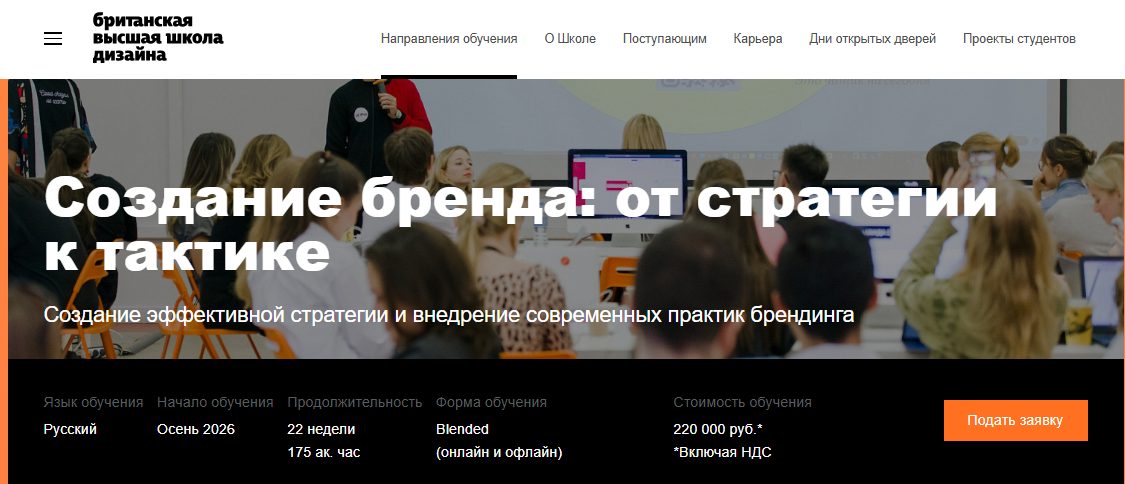 Курс Практика бренда (Создание бренда: от стратегии к тактике). Продолжительность 22 недели, 175 академических часов. Стоимость 220.000 руб. В программу включены такие темы: