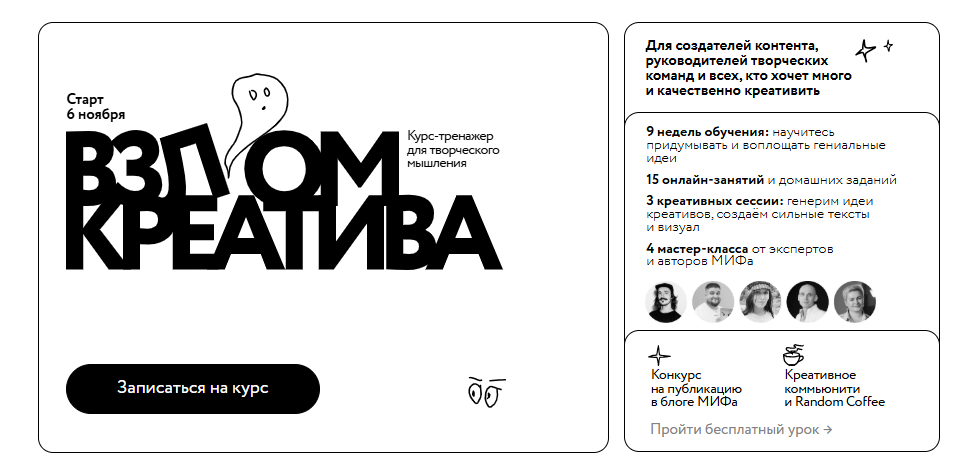 Со слов автора, он предназначен для авторов контента, команд-разработчиков и всех тех, кому нужно придумывать идеи в работе. Курс представляет собой онлайн-тренажер для развития нешаблонного мышления. В программу включено 15 онлайн занятий с домашними заданиями и 3 креативных сессии. Время обучения — 9 недель. Формат обучения включает живые вебинары, практические домашние задания, возможность публикации лучших работ в блоке издательства, а также доступ к чату участников.