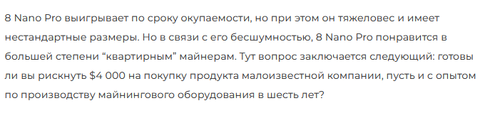 Asic Miner 8 Nano Pro выпускается малоизвестной китайской компанией ASICMiner, которая за более, чем 12 лет работы, так и не получила широкой признательности. Модель Про нано в сравнении с аналогами обладает увеличенной производительности и короткими сроками окупаемости. Но вес оборудования значительный, размеры нестандартные. Такой тип устройств предпочитают квартирные майнеры.