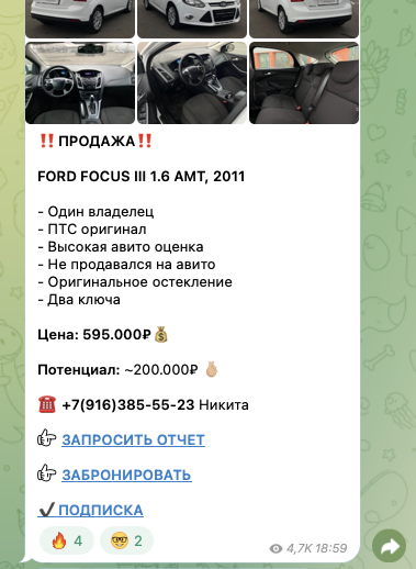 - информация о подготовленных к продаже автомобилях на тг-канале очень скудная.