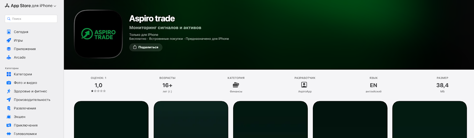 Отзывы пользователей об Аспиро Трейд на момент анализа ограничены, что наверняка связано с небольшим сроком работы проекта. При этом рейтинг В App Store низкий, 1/5 на основе лишь одной оценки.