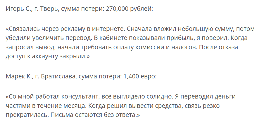 Описанные схемы — классическая работа мошеннического брокера. Сначала привлечь высокой прибылью, потом заблокировать счет и в конце дожимать на дополнительные платежи.