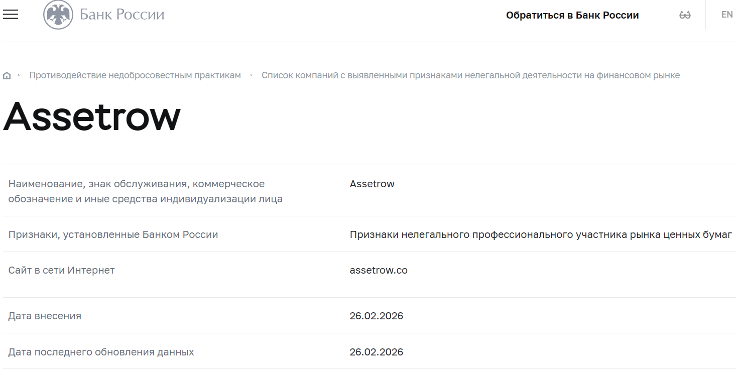 Assetrow — максимально сомнительный брокер. Компания нигде не зарегистрирована, сделала сайт на коленке и представляется совершенно другой организацией. При этом, входит в реестр запрещенных участников рынка ценных бумаг в России.