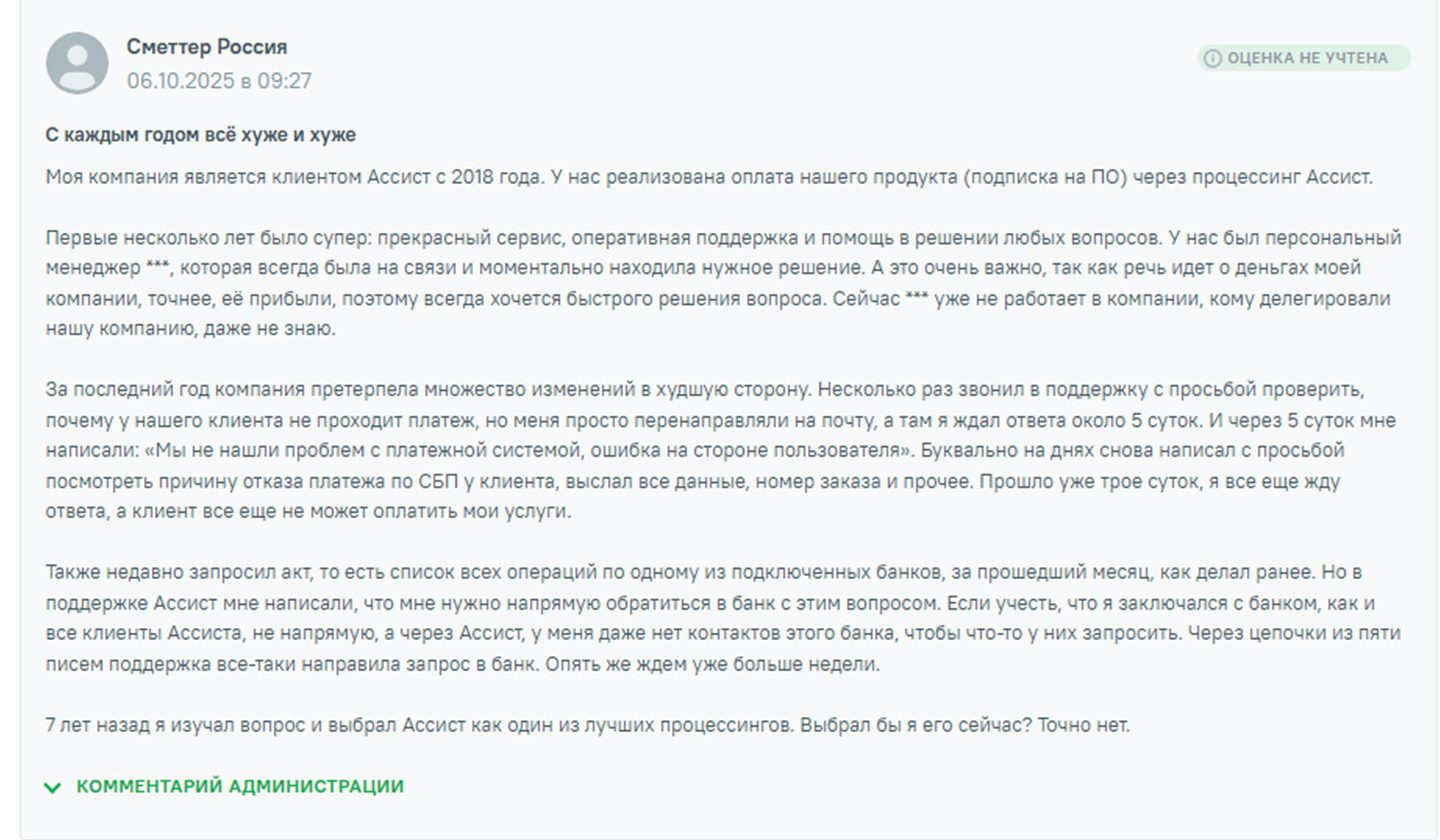 На платежную систему «Ассист» отзывы противоречивые, но среди них большая негативные. Клиенты платформы отмечают, что в последнее время сервис стал значительно хуже и они подумывают прервать сотрудничество.